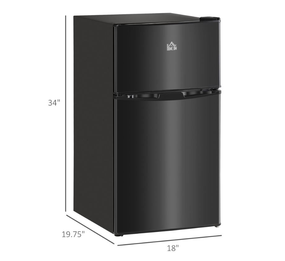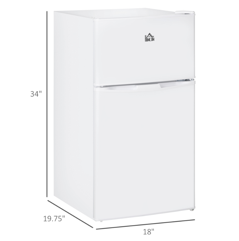 - Material: Steel, Plastic - Overall Size: 18" W x 19.75" D x 34" H - Freezer Size: 13.25" W x 15.25" D x 7.5" H - Refrigerator Size: 15" W x 15" D x 19.25" H - Crisper Drawer Size: 14.25" W x 5" D x 7" H - Capacity: 2.26 Cu.Ft (Refrigerator), 0.95 Cu.Ft (freezer), 3.2 Cu.Ft (total) - Lamp Power: 10 W - Noise: 39 dB - Door Opening Angle:180° - Power: 60 W, 115 V, 60 Hz; - Cable Length: 5.6 ft - Weight Capacity: 33 lbs. (shelf)