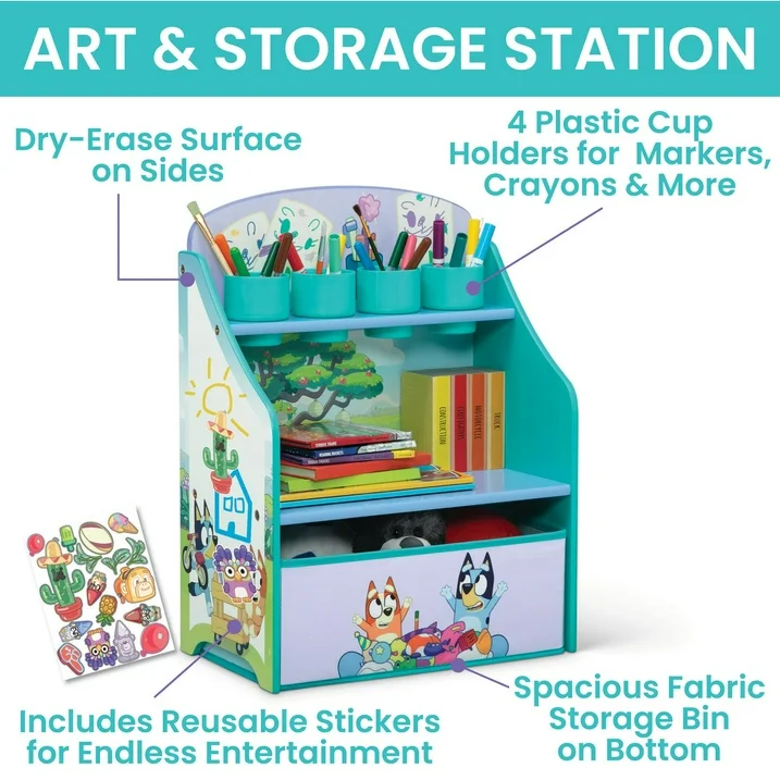 Cater to your little one’s creative side with this Bluey 3-Piece Art & Play Toddler Room-in-a-Box by Delta Children! A versatile set covered in lovable Bluey graphics makes it easy for kids to draw, paint, play and learn, while at the same time develop imagination, creativity and hands-on ability. This all-in-one art and play solution includes a Draw & Play Desk, Art & Storage Station and Fabric Toy Box.