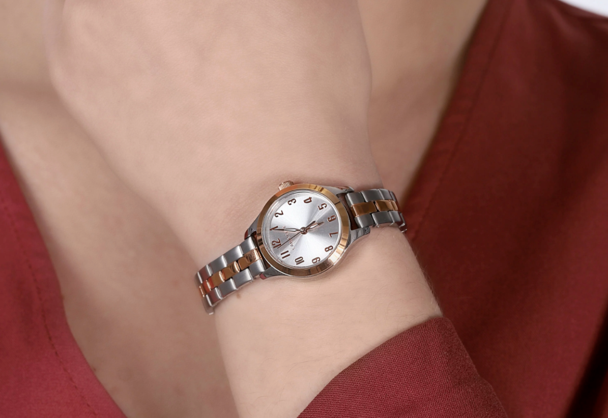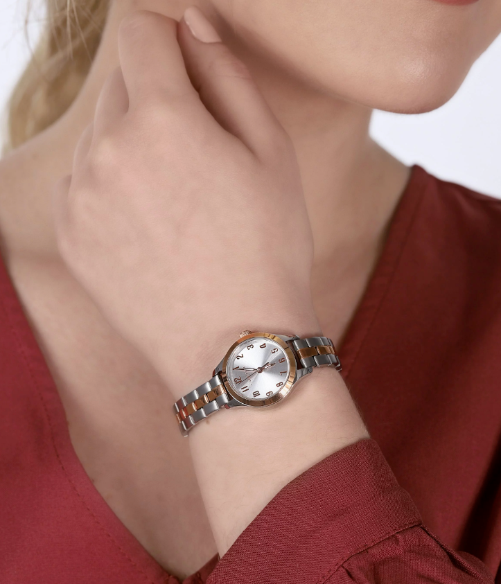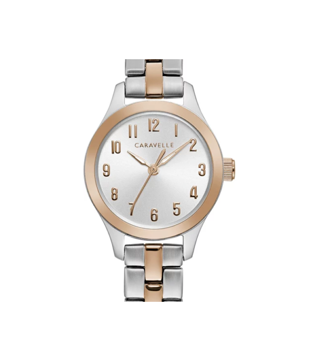 Less is more with this gracefully proportioned rose gold-tone accented stainless steel case with easy-to-read numerals on silver-white sunray dial. Alternating polished and brushed three-link stainless steel bracelet with rose gold-tone accents and jewelers clasp closure.