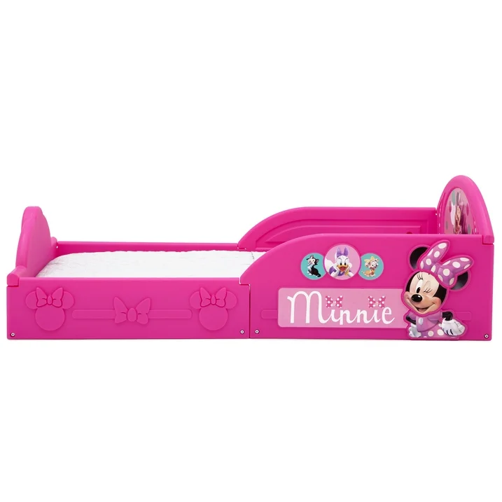 Transition their space from a nursery to a toddler room with the perfectly sized Minnie Mouse Plastic Sleep and Play Toddler Bed from Delta Children. Featuring three-dimensional silhouettes of Minnie Mouse with colorful decals of Minnie, Daisy Duck, Figaro and Bella, this sturdy toddler bed creates a comforting environment that promotes a sound sleep. Attached Guardrails: Attached guardrails will ensure your little one is safe and secure throughout the night. A low mattress height makes it easy for kids to enter and exit on their own, reinforcing their big-kid independence. Sturdy Plastic: Built to last, this toddler bed?s sturdy plastic construction creates a cozy, inviting environment, promoting sound sleep for your little one. About Minnie Mouse: Sweet, stylish and a lover of all things polka dot, Minnie Mouse spends her free time dancing, singing and hanging out with her lifelong sweetheart, Mickey. Help bring her cheerful spirit to your little one?s room with this item from Delta Children?s colorful collection of Minnie Mouse kids' furniture.