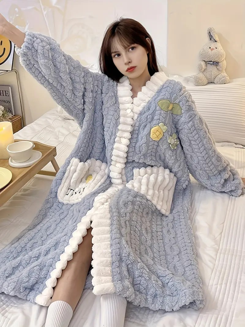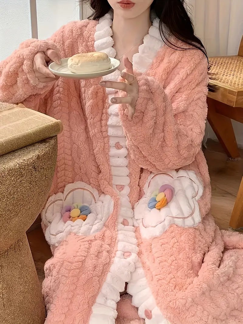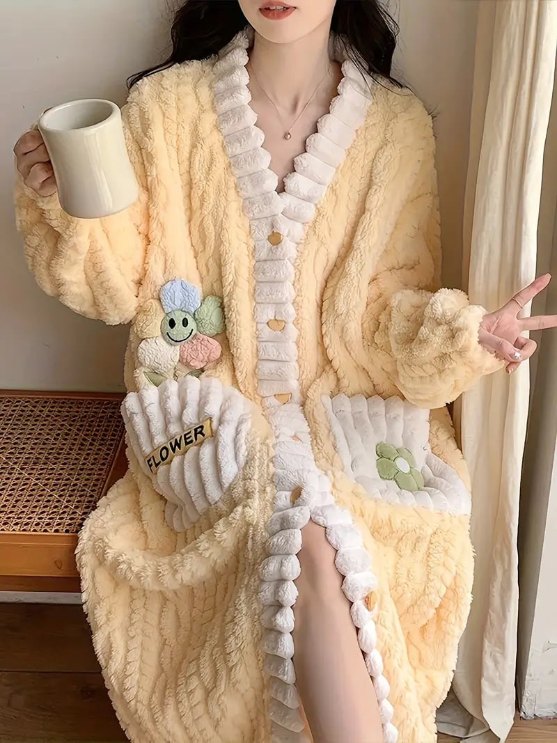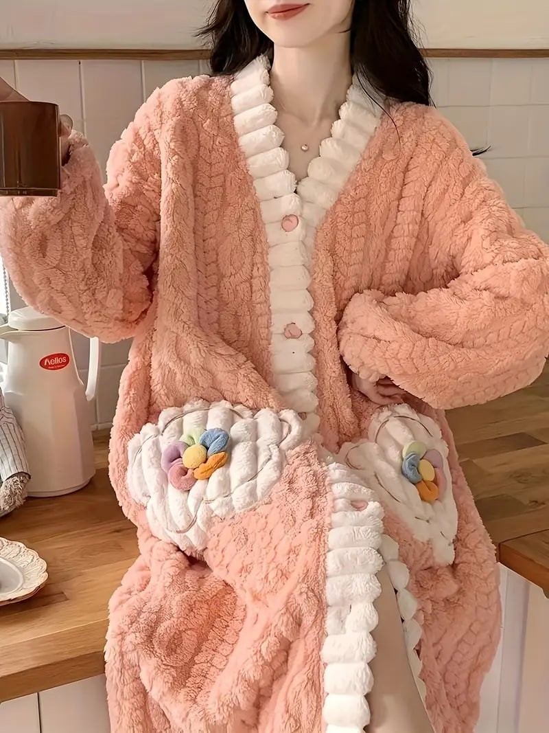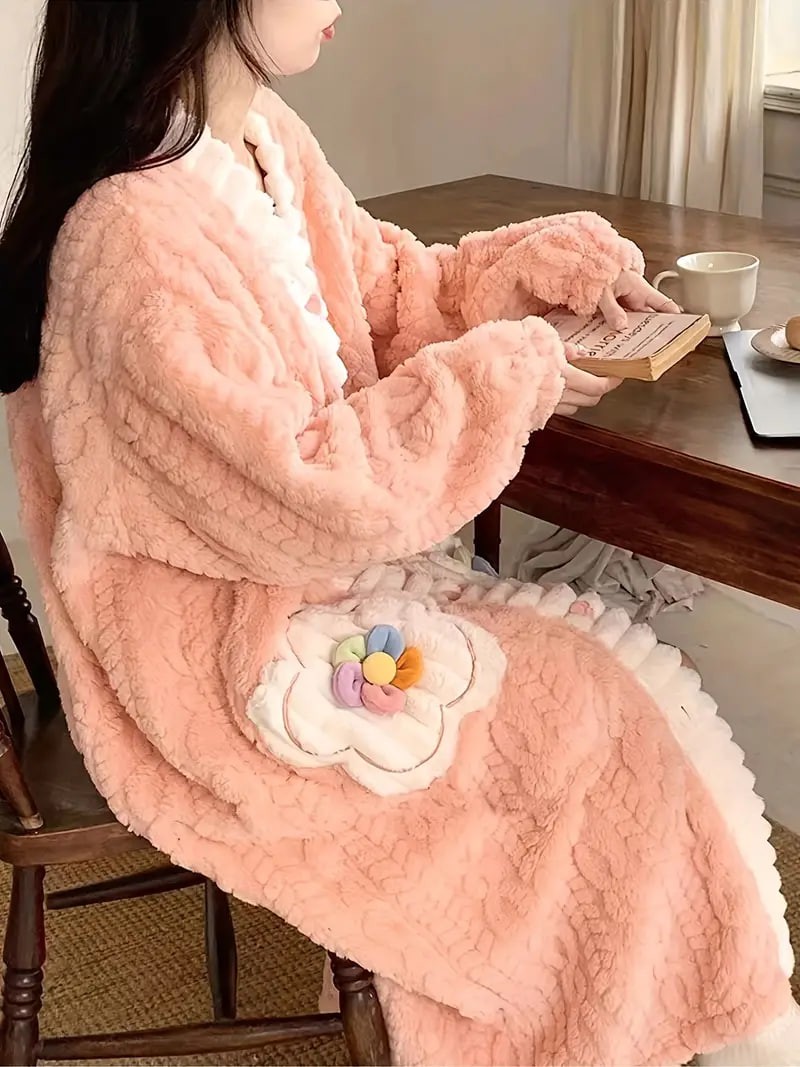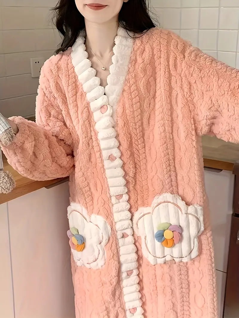 flower decor fuzzy night robe cute long sleeve v neck robe with pockets womens sleepwear details 20flower decor fuzzy night robe cute long sleeve v neck robe with pockets womens sleepwear details 20