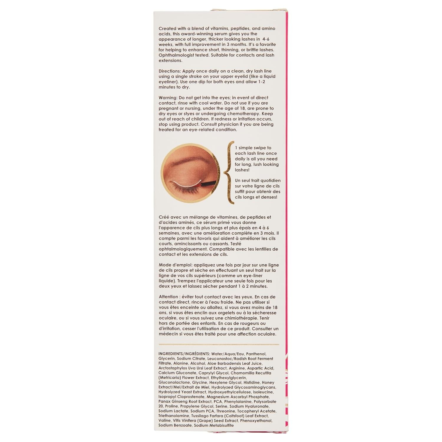 Do not apply to the lashes themselves or lower lash line. Apply only with the product applicator. Use sparingly as dripping into the eye may cause irritation or other unwanted effects. If serum drips into the eye, immediately rinse thoroughly with cool water to completely remove. Warning: For external use. Avoid getting in eyes; if so, immediately rinse thoroughly with cool water. Do not use if under the age of 18, pregnant or nursing, undergoing treatment for glaucoma or cancer, or if you have ever experienced dry eyes, eye infections, styes or any other eye-related disorder. If redness, irritation or other unwanted effects occur, stop using product immediately. If symptoms persist, seek medical attention. Keep out of reach of children.