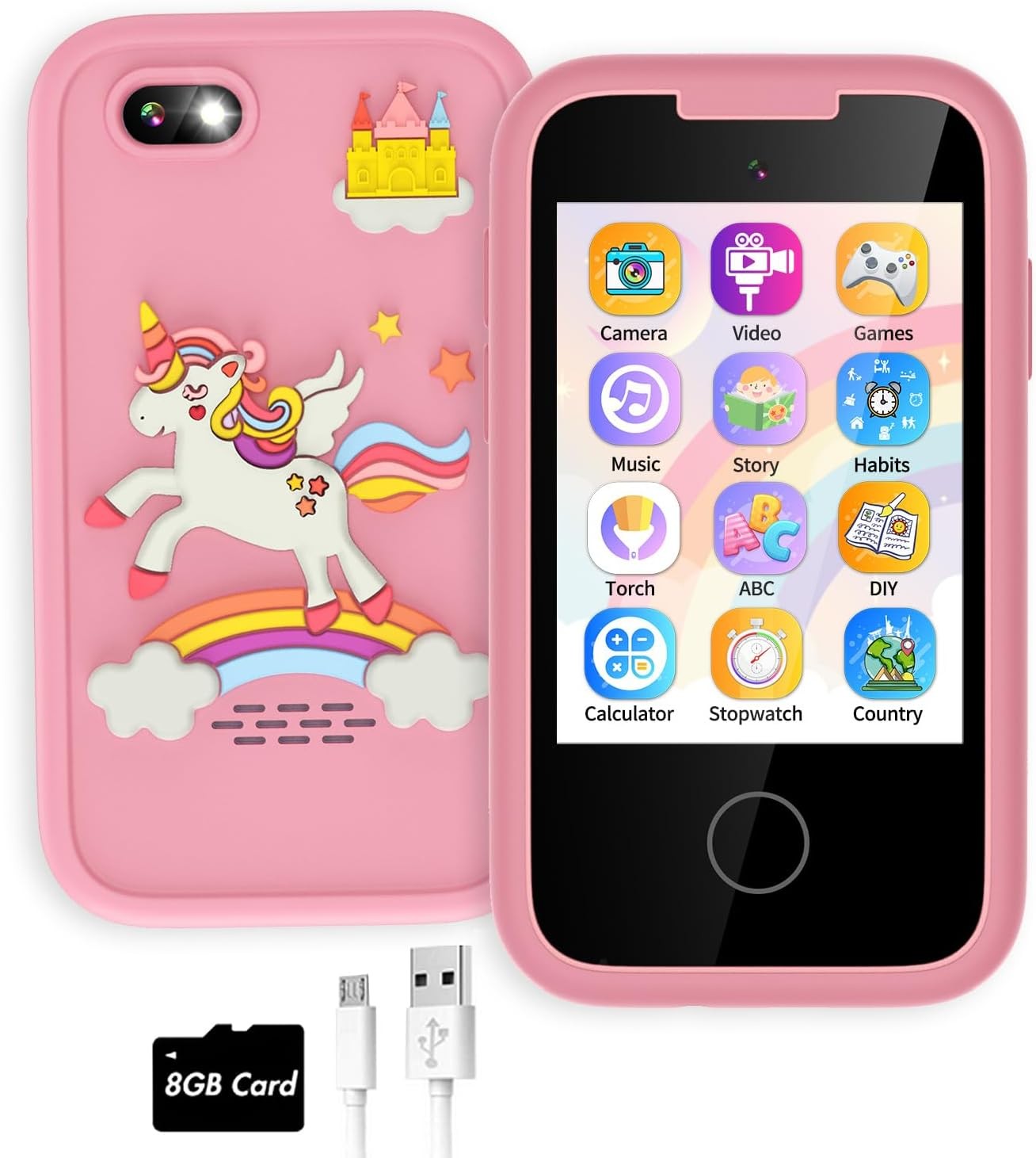 • ?【Multi-functional Phone for Kids】With 2.8” touchscreen, kids phone has rich features, including camera, video recording, habit tracker, ABC alphabet, stories, music, torch, voice recorder, 13 games, calculators, stopwatches, alarm, etc The kids smartphones can satisfy kids' curiosity. Great toys for ages 5-7 as a girl birthday gift ideas.