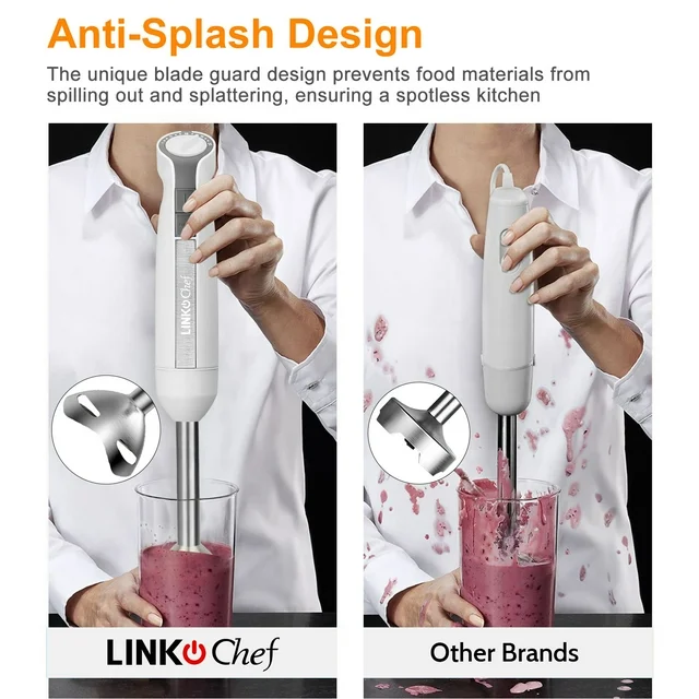 【5-in-1 Hand Blender Kit 】Hand blender contains whisk, mixer,milk frother, 500ml chopper and 600ml measuring cup. Our product is the perfect combination for family tasks, such as chopping, whisking, whipping, juice or puree. It meets your needs!
