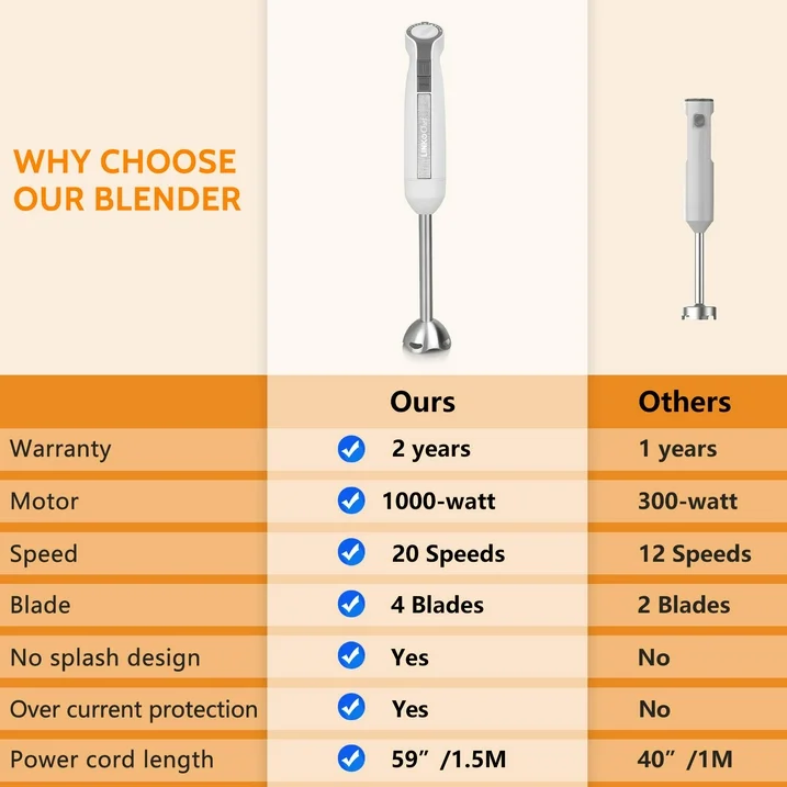 【Immersion Blender 1000W】Also known as a hand blender,equipped with all copper motor.It offer maximum power 1000 watts,Just press blender with one hand for a few seconds, the evenly mixed smoothies, baby food, protein shakes, sauces,salad,squash soup and mayonnaise. Adopt the four-leaf sharp 304 stainless steel blade. Make food mixing more effective, even and smooth.