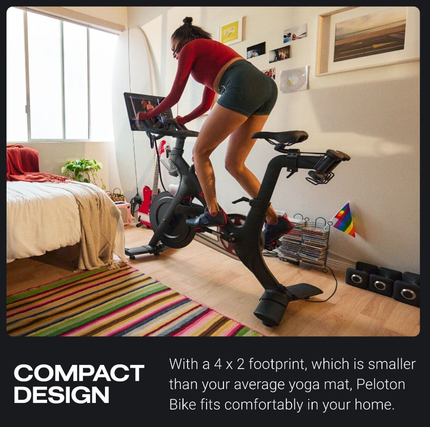 Small-space friendly - Peloton Bike has a compact, 4' x 2' footprint, and an adjustable seat, handlebar, and screen, which tilts to accommodate different heights. This stationary bike fits comfortably in your home whether you're low on square footage or working around furniture.