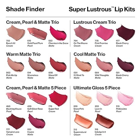 First, choose your favorite lip finish. Now, find your perfect Super Lustrous™ Lip Kit! Or try the Multi Finish Lip Kit for several finish options in a single kit. (This kit contains two pearl-finish lipsticks, two cream-finish lipsticks, and one matte-finish color.) With multiple shades of our iconic Super Lustrous™ lipstick or lip gloss on hand, you can experience the #1 Lip Brand in America* in different ways—depending on your Lip Kit—with a matte, pearl, cream, or glossy lip gloss finish. *REVLON calculation based in part on data reported by Nielsen through its ScanTrack Service for the Lip Make-Up category for the 52 weeks ending June 27th, 2020, for the total U.S. market, xAOC, according to Revlon’s custom product hierarchy.