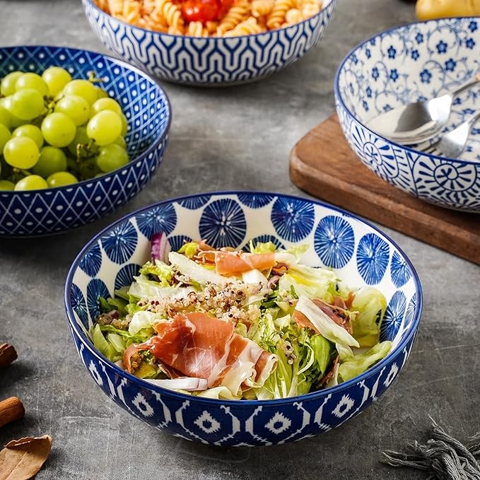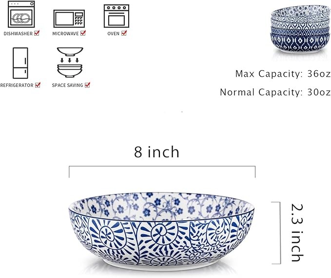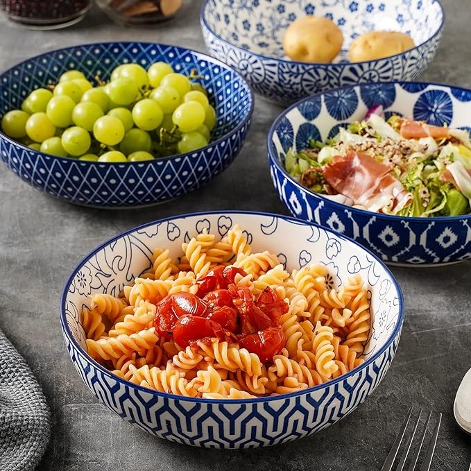 Selamica Ceramic 30 Ounce Large Pasta Bowls 8 inch Serving Bowls Wide and Shallow Microwave Dishwasher Safe Bowls Set of 4, Vintage Blue
