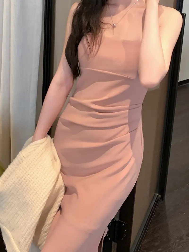 Solid Pleated Split Hem Tank Dress, Elegant Sleeveless Square Neck Dress For Spring & Summer, Women s Clothing details 0Solid Pleated Split Hem Tank Dress, Elegant Sleeveless Square Neck Dress For Spring & Summer, Women s Clothing details 0